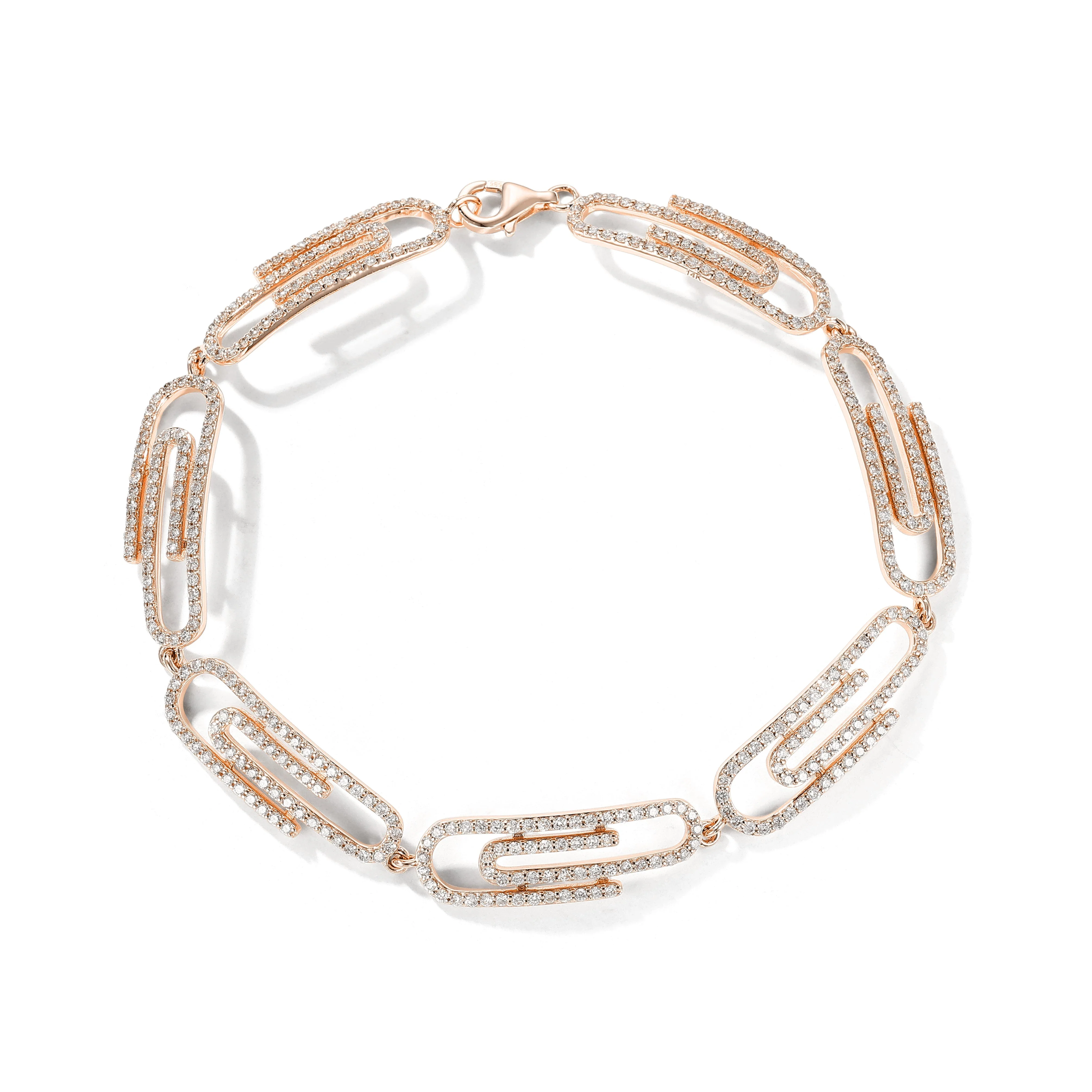 Introducing our signature diamond paper-clip bracelet - a unique twist on the conventional chain bracelet. Each paper clip is cast in gold and handset with beautiful natural diamonds that sparkle with every movement. This attention-grabbing bracelet is a statement piece that adds sophistication to any outfit. Whether worn alone or layered with other pieces, our diamond paper-clip bracelet is a timeless addition to any jewelry collection. Elevate your style and showcase your individuality with this exquisite bracelet.